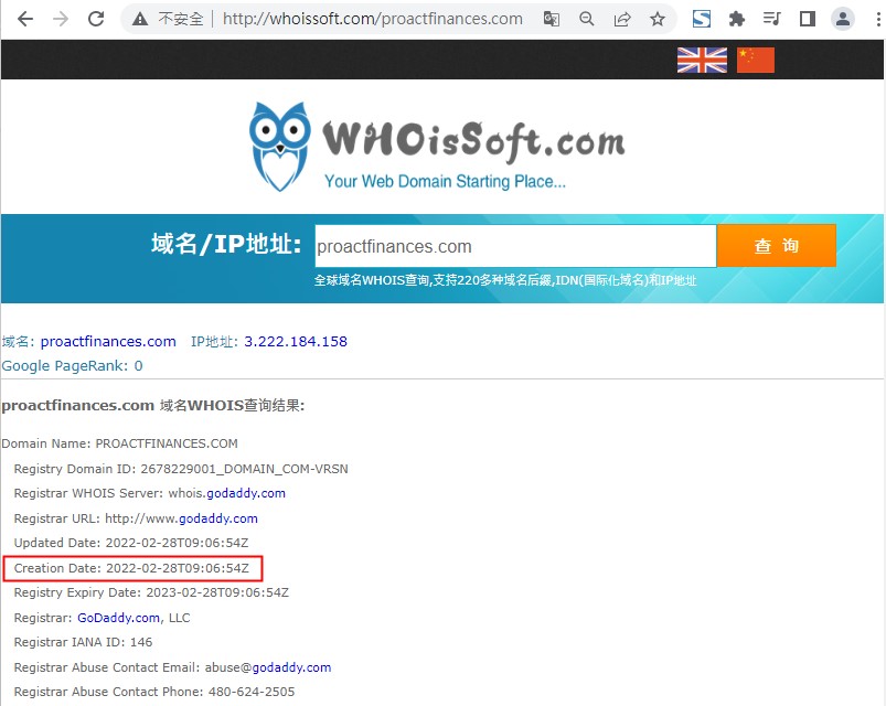 首先是域名。Proact finance Limited的域名非常新,创建与2022年2月28日,平台年龄4个月零25天,是个“新生儿”。