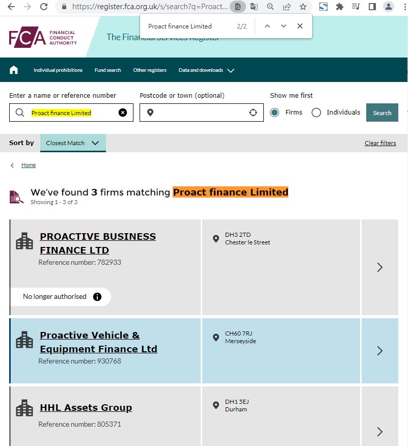既然公司位于英国,那理应有英国的工商注册和FCA的监管牌照。但经过查询,我们发现Proact finance Limited却是真假参半,真的是有英国的工商注册,工商网能查到对应名称;假的是在英国FCA却没有找到完全匹配的公司,而这也就是Proact finance Limited没有宣称受到任何监管的原因。