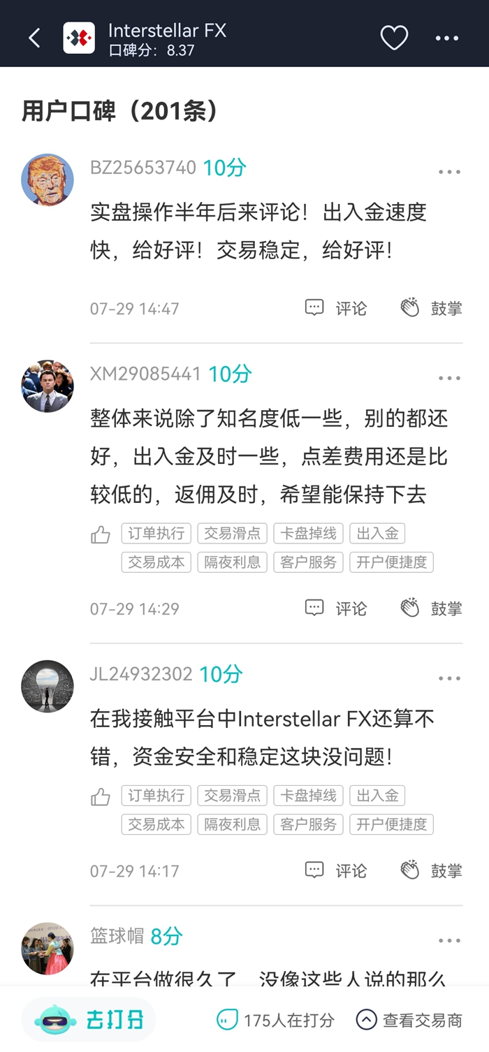 在7月的天网查口碑中,星际收到的都是高分评论:开仓速度快、出入金速度快、客服有耐心等,没有用过星际的汇友不妨试试。