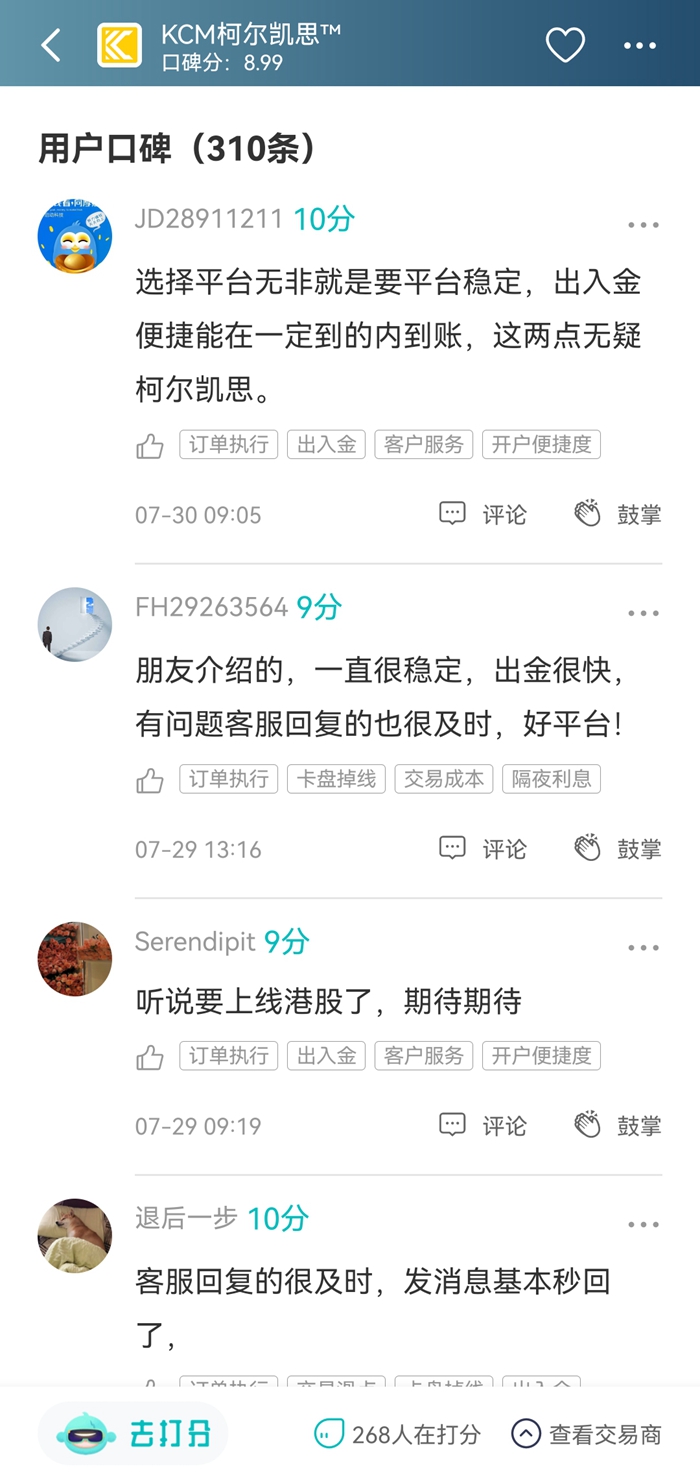 在天网查汇友口碑区,一位用户这样写道“朋友介绍过来的,之前犹豫了很久,看了这平台的资料和口碑才决定入金,前两天出金很快就到账了,好感加倍…… ”用户对新平台的考验需要很长一段时间,希望柯尔凯思能经得起时间考验。