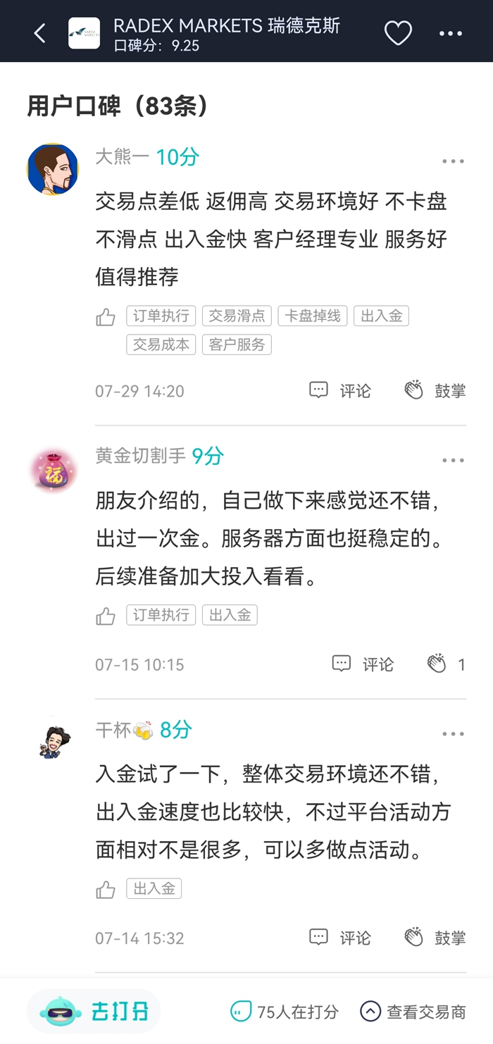 7月的瑞德克斯在天网查收获了不少好评,交易点差低、返佣高、出入金速度快是用户点评比较多的点。