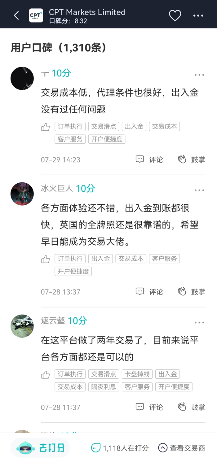 7月CPT Markets收获大量好评,好几个用户在口碑区写下“老、稳、快、顺”四字评论,概括了该平台的优点。