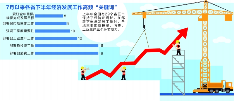 在部署下半年发展工作时,除了继续落实已出台的稳增长一揽子政策和做好助企纾困工作外,各地主要围绕投资、消费、工业生产三个环节发力。据记者统计,7月以来,至少有18个省区市明确将加大稳投资力度,包括加快项目投资进度或加大项目储备力度等;至少有18个省区市明确将促进消费,包括扩大消费需求或强化消费对经济的拉动作用等;至少有12个省区市明确要发力工业增长,包括促进工业增产增效等;至少有9个省区市明确将进一步保市场主体,包括完善惠企措施,实施市场主体倍增工程等。