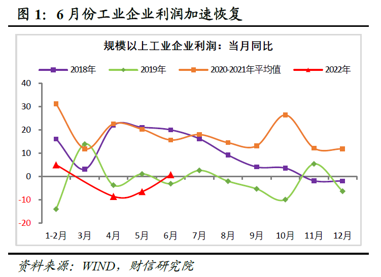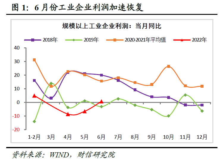 事件:2022年1-6月份全国规模以上工业企业利润总额同比增长1%,增速与1-5月份持平;6月当月规上工业企业利润同比增长0.8%,增速由连续两个月下降转为正增长,较上月提高7.3个百分点,呈加速恢复态势。但占规模以上工业利润比重为76.2%的制造业,6月份利润同比仍下降9%,41个工业大类中有20个行业利润同比为负,工业企业亏损面依旧较大,未来生产经营仍面临较多困难。