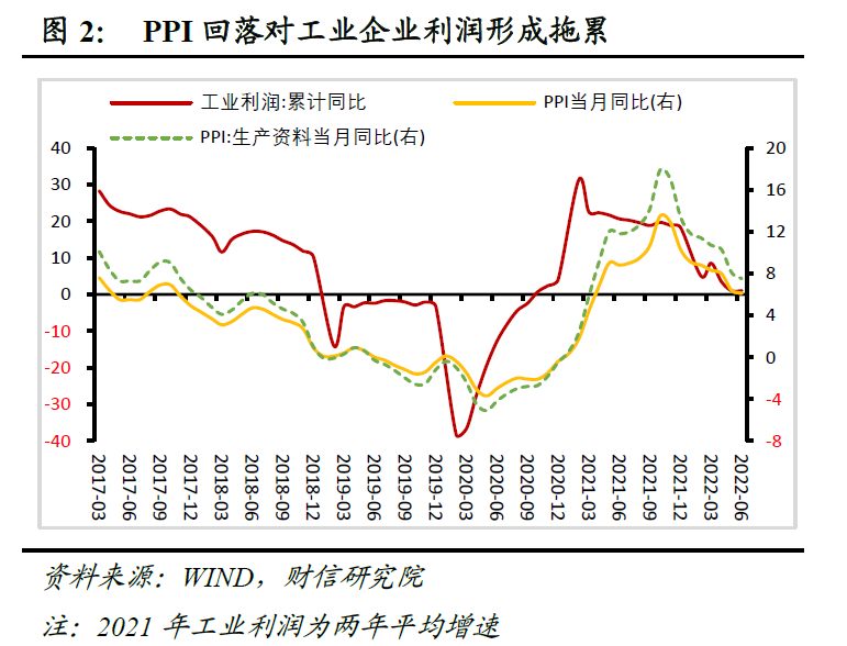 二是价格方面,受疫情供给堵点逐渐打通、保供稳价政策效果显现、国际大宗商品价格震荡下行和翘尾因素走低等因素的影响,6月份工业生产者出厂价格指数(PPI)和生产资料价格指数分别增长6.1%、7.5%,较5月份分别降低0.3和0.6个百分点,继续对利润修复形成一定拖累(见图2)。