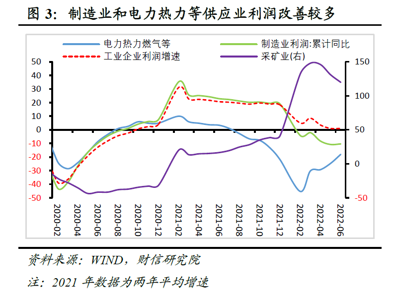 一是从三大门类看,采矿业利润增速高位放缓较多,制造业和电力热力燃气等供应业利润增速明显改善。如6月份,采矿业利润同比增长77.9%,较5月份大幅回落14.3个百分点;电力、热力、燃气及水生产和供应业利润增长13.1%,增速由负转正较上月提高约20个百分点;制造业利润仍下降9%,但降幅较上月也大幅收窄9.5个百分点。