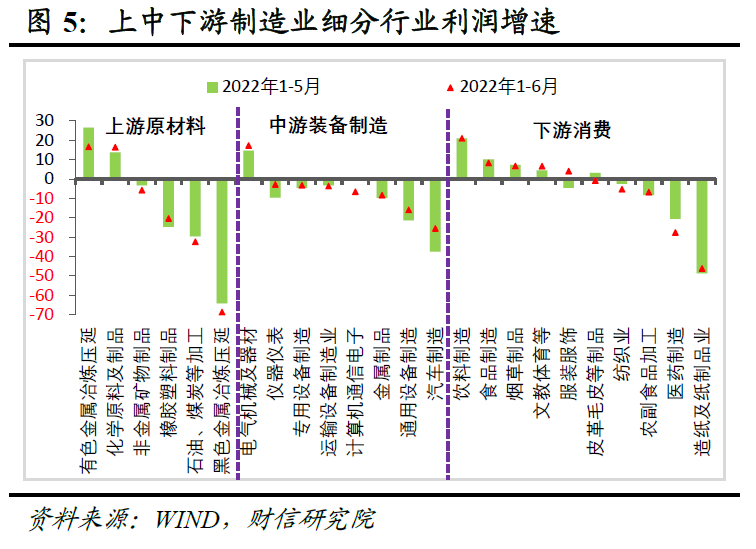 二是从制造业内部看,汽车等装备制造业利润大幅改善是主要贡献力量,下游消费品制造降幅收窄,上游原材料制造增速回落。其一,受大宗商品价格环比回落和国内PPI增速持续放缓的影响,上游原材料行业利润增速多数继续减慢。如1-6月份有色/黑色金属冶炼压延、非金属矿物制品、石油煤炭等价格业利润增速,均较1-5月降低2.5个百分点以上(见图4-5)。其二,受益于产业链供应链持续恢复,加之出口增长保持韧性,装备制造业利润增速由4月的-32.2%、5月-9%提高至6月的4.1%,连续两个月大幅回升,拉动规模以上工业企业利润增速较上月回升4.0个百分点,贡献了本月一半以上的增幅。其中,汽车制造业因上海、吉林等汽车主产地加快复工复产,6月份利润由下降转为大幅增长47.7%,是拉动工业企业利润回升作用最大的行业;同时仪器仪表、通用设备等其他装备制造业1-6月累计增速较1-5月均提高5个百分点以上,修复力度也非常大(见图5)。其三,随着消费市场继续恢复,6月份消费品制造业利润降幅较上月收窄6.7个百分点,但同比下降11.7%,仍处于深度负增长区间。其中,医药制造业和皮革毛皮等制品业累计利润增速较上月分别降低7.0和4.0个百分点,是主要拖累因素;同期服装服饰、农副食品加工、造纸及纸制品业等其他消费行业利润继续呈现出边际改善态势(见图5)。