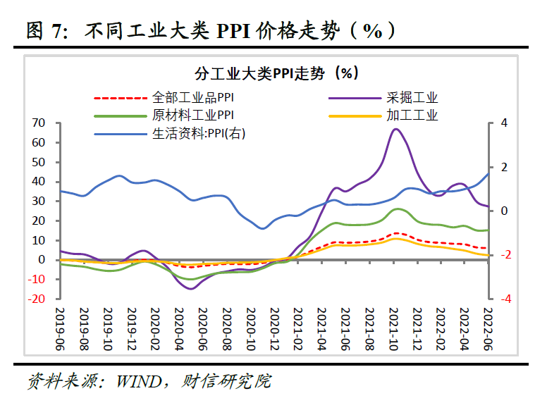 三是中下游利润占比明显回升,上游利润占比连续两个月回落,利润结构持续改善。1-6月上游采矿业和原材料制造业利润占全部工业的比重为45.6%,较1-5月份大幅回落2个百分点;同期中游装备制造业和下游消费品制造业利润占比,分别较1-5月份提高1.2和0.6个百分点,利润结构持续大幅好转(见图6)。上中下游利润分化持续缓解,一方面与价格的分化减弱密切相关。如6月份采掘工业PPI增速较上月回落2.4个百分点,对采矿业利润形成重大拖累,同期加工工业PPI增速较上月仅回落0.8个百分点,生活资料PPI则较上月提高0.5个百分点(见图7)。另一方面产业链供应链持续恢复、出口强劲和促消费政策加码,也对推动中下游行业生产和利润恢复产生了重要积极作用。