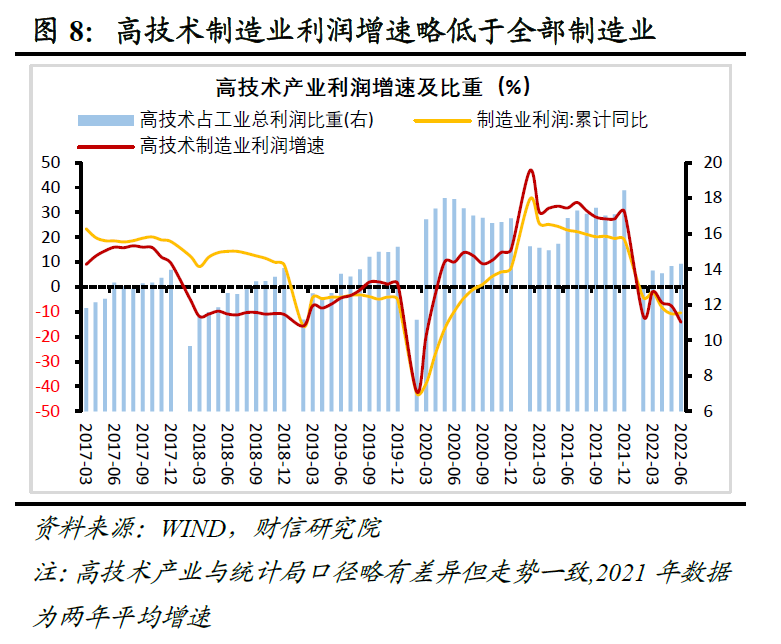 四是高技术制造业利润增长有所放缓。根据我们的统计,1-6月份高技术制造业利润同比降幅有所扩大,且增速已低于同期全部制造业(见图8),主因受高基数效应影响,高技术制造业中医药制造业利润回落较多(上半年同比下降27.6%)。但国内新旧动能转换的大趋势未变,从占比看,2022年1-6月份高技术制造业利润占规模以上工业利润的比重,较2019年同期仍高0.6个百分点。