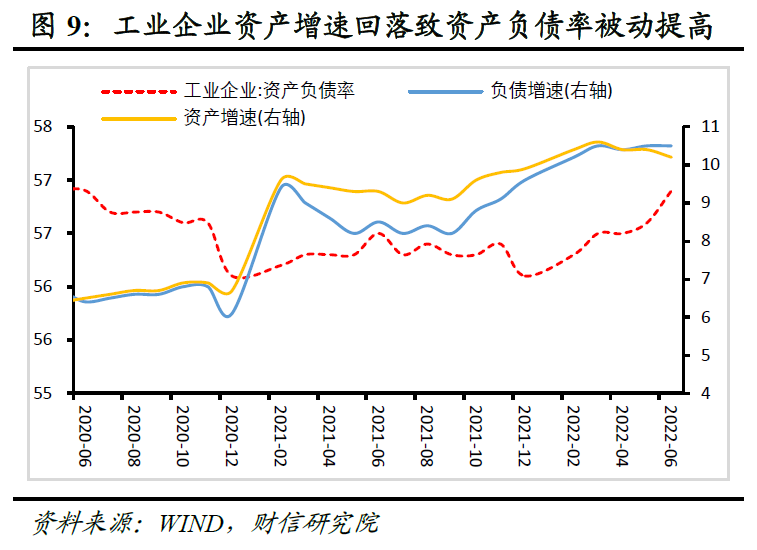 从资产和负债增速看,6月末两者分别与上月回落0.2个百分点和持平,分别为10.2%和10.5%(见图9),前者增速下降是资产负债率提高的主因,表明资产负债率提升并非企业主动加杠杆,而是企业经营困难增加,导致其资产负债表面临收缩风险,被动式推高了资产负债率。