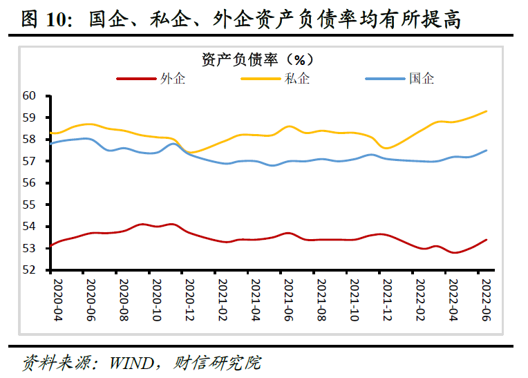 分企业类型看,私企、外企和国企资产负债率均回升,但外企被动提高概率大,私企或为主动加杠杆。6月末国企、私企和外企资产负债率分别为57.5%、59.3%和53.4%,分别较5月末提高0.3、提高0.3和提高0.4个百分点(见图10)。由于不同类型企业的资产和负债增速数据需要晚几天公布,因此暂时无法完全判定上述三者是否为主动加杠杆。但根据以往的数据,5月份外企资产和负债增速分别较去年末降低2.0和2.5个百分点,加之上半年外企利润增速同比下降13.9%,表现最差,表明外企资产负债表陷入衰退的风险更大,其资产负债率提高或更多源于资产增速下降更快导致的被动提高,未来仍需加大力度稳外资稳外贸。此外,今年以来私企资产负债率、资产增速和负债增速均同步抬升,表明受益于逆周期政策持续加码,私企资本开支有所增加。
