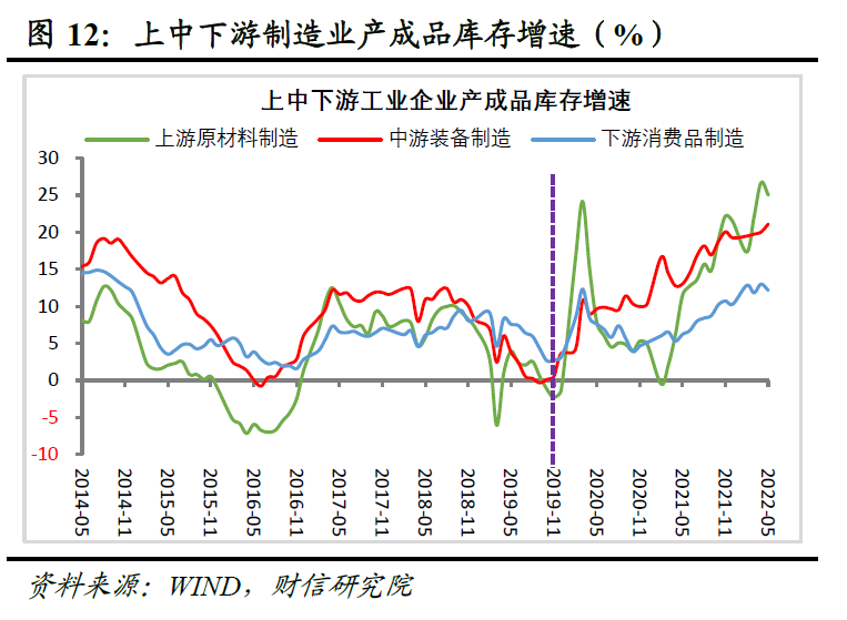 展望未来,预计工业企业大概率已步入新一轮去库存周期。一是随着疫情等短期冲击消退,加上逆周期政策进一步发力显效,国内需求有望逐步恢复,有利于积压的库存消化。二是根据历史经验,PPI增速与工业企业库存增速高度相关,未来随着国内PPI增速持续回落,将推动企业全面转向去库存周期。三是自2019年末以来工业企业补库存周期已持续两年半以上,接近历史上国内补库存周期的最长期限,未来转向去库存已是大势所趋,同时分行业看,上、中、下游制造业库存增速均已处于历史高位区间,后续上行动力也均已有限(见图12)。