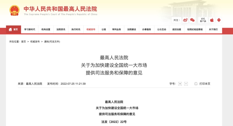 7月25日,最高人民法院发布《关于为加快建设全国统一大市场提供司法服务和保障的意见》。其中提出,依法打击垄断和不正当竞争行为。强化司法反垄断和反不正当竞争,依法制止垄断协议、滥用市场支配地位等垄断行为,严厉打击侵犯商业秘密、商标恶意抢注、攀附仿冒等不正当竞争行为,加强科技创新、信息安全、民生保障等重点领域不正当竞争案件审理。