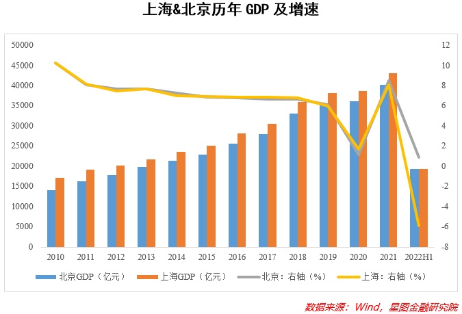 北京也不是相安无事。同样是在二季度,北京也先后经历了数轮疫情的反弹,虽然形势远不及上海那般严峻,但经济还是不可避免地受到了影响,再叠加去年同期新冠疫苗生产贡献的高基数等因素的客观存在,致使北京二季度GDP下滑了2.9%。而得益于一季度的良好表现,北京上半年GDP还是实现了正增长,为0.7%。