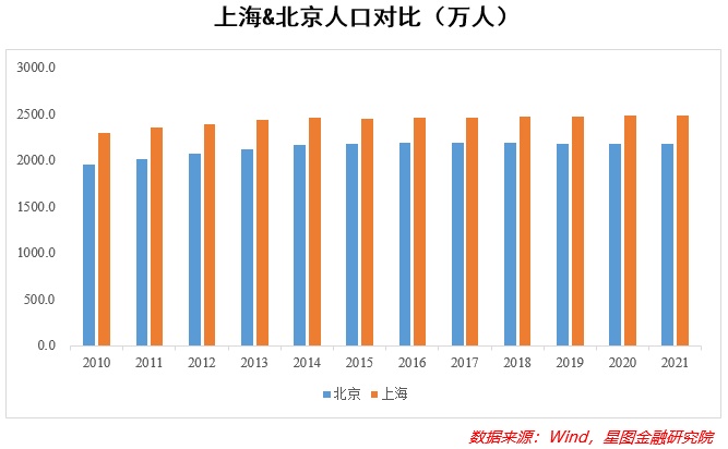 上海和北京,都是名副其实的“超大城市”,二者的常住人口数量早在2009年和2011年就已先后突破2000万。虽然近几年京沪两座城市都有意识地采取了控制人口规模的相应措施,人口增长速度有所放缓,北京甚至还出现了人口的负增长,但总体规模依然不容小觑。2021年,上海和北京的人口数量分别为2489.4万和2188.6万,放眼全国都是首屈一指的存在。