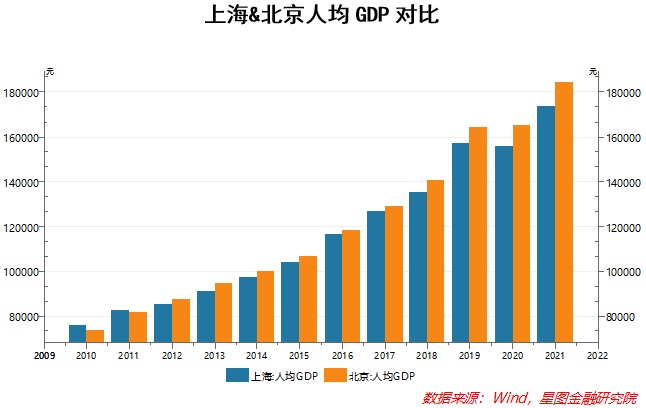 数据显示,在人均GDP方面,北京比上海要略占优势,二者在2021年的人均GDP数据分别为18.4万元和17.4万元,且均达到了国际认可的初等发达国家水平(即人均GDP超过2万美元),经济发展都极具基础和底气。北京的GDP规模不及上海,而人均GDP却稍微高于上海,原因可能在于北京的人口数量小于上海,而并非经济发展水平层面的实质性差距。
