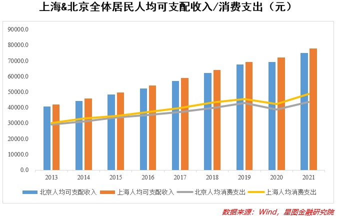在人均可支配收入方面,京沪两城都是常年保持在极高的水平,在全国也是遥遥领先。不过不同于人均GDP,上海的人均可支配收入要比北京更高一些,且差距有逐年拉大之势。2021年,上海人均可支配收入达到了7.8万元,北京为7.5万元。而在人均消费支出方面,上海同样要领先于北京。不难发现,上海居民相对更能享受到城市经济增长带来的红利,生活质量相对更高,获得感也更强。