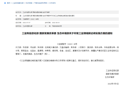 原标题:工业和信息化部 国家发展改革委 生态环境部关于印发工业领域碳达峰实施方案的通知