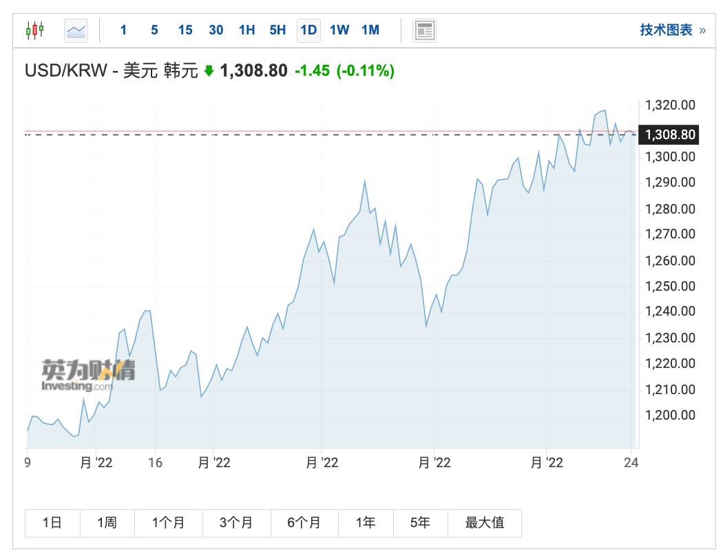 随着全球投资者转向美元资产,韩元兑美元汇率今年以来已经累计下跌约9%,成为亚洲表现最差的货币之一。尽管韩国央行过去近一年已经加息多次,但仍不足以遏制韩元走低。