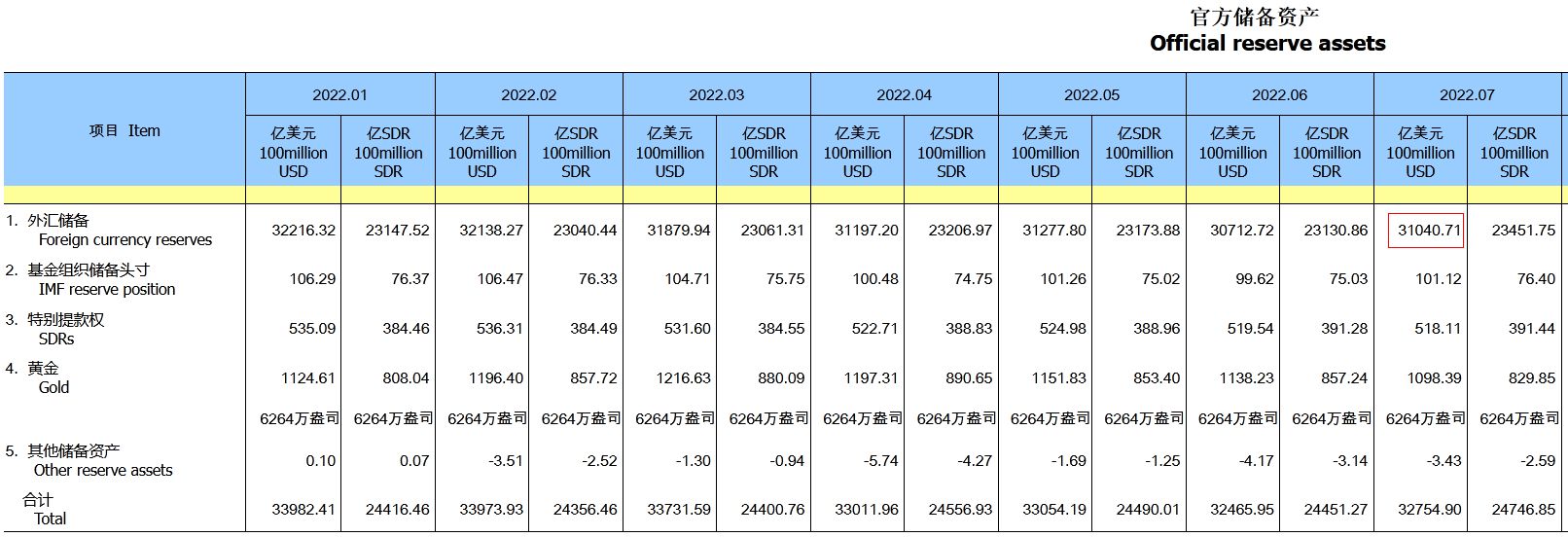 对于2022年7月份外汇储备规模变动情况,国家外汇管理局副局长、新闻发言人王春英表示,截至2022年7月末,我国外汇储备规模为31041亿美元,较6月末上升328亿美元,升幅为1.07%。