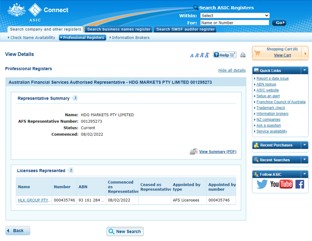 从HDG Markets的官网可以看到,其自称受到澳大利亚金融监管局ASIC监管,监管号为001295273。我们在ASIC官网的查询情况如下: