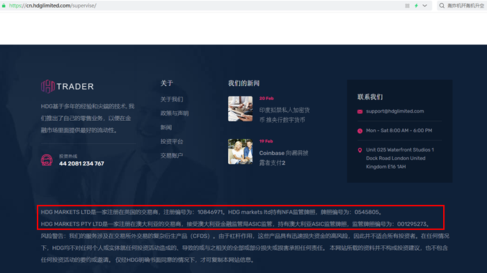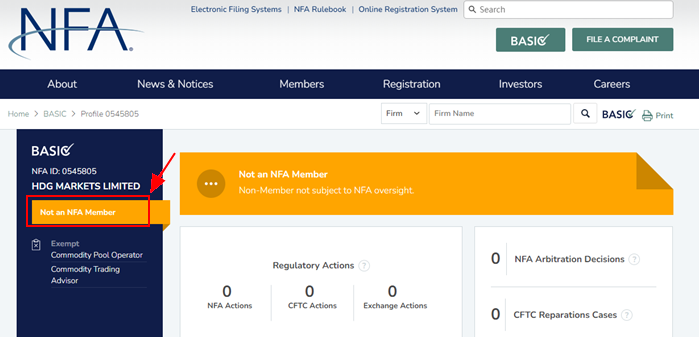 HDG Markets在官网称英国有注册公司HDG Markets LTD,但仅有注册没有受FCA监管。HDG Markets还称持有NFA监管牌照,但查询结果是只有注册,并不是NFA会员,所以根本不受美国监管。