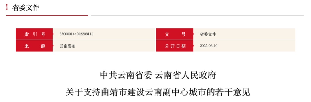 8月10日,云南省发布《关于支持曲靖市建设云南副中心城市的若干意见》。