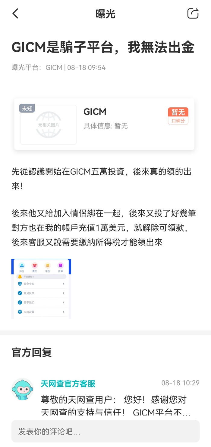 也是在最近,另外一个网友也曝光了GICM交易账户存在无法登陆的问题。天网查根据投诉汇友提供的GICM官网,对该平台进行了合规性调查。