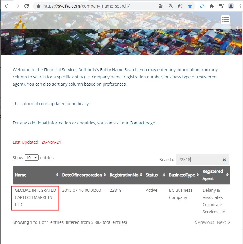 在圣文森特FSA查询注册号22818,其对应公司名称GLOBAL INTEGRATED CAPTECH MARKETS LTD,首字母缩写与GICM平台匹配。但需要注意的是:圣文森特FSA根本不监管金融衍生品,即便GICM在其上有注册,它也依然是一个没有监管的虚假平台。