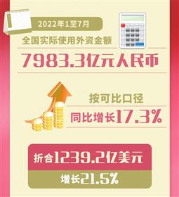 综合新华社电 记者18日从商务部获悉,2022年1至7月,全国实际使用外资金额7983.3亿元人民币,按可比口径同比增长17.3%(下同),折合1239.2亿美元,增长21.5%。
