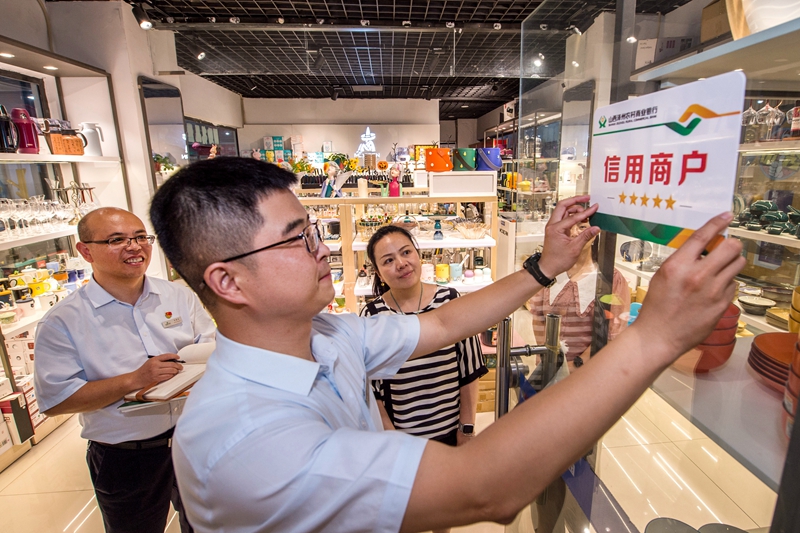 日前,山西泽州农商银行工作人员在月星商业广场为已评定星级的信用商户张贴信用牌。据了解,近年来,该行积极践行普惠金融,以“服务下沉”为抓手,组建36支“授信金融服务队”,大力推进信用村、信用市场评定工作。目前,该行已创建信用村127个、信用市场5个,对7.2万户授信65.2亿元,推进了辖区信用环境建设。 本报记者 刘志良 摄