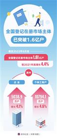 新华社北京8月17日电 截至6月底,全国登记在册市场主体1.61亿户,较2021年底增长4.4%。其中企业5038.9万户,增长4.1%;个体工商户10794.1万户,增长4.6%。