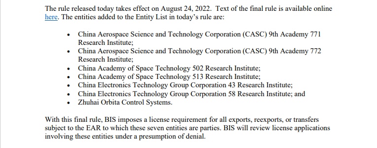 值得注意的是,A股的欧比特疑似在名单之列,美国商务部原稿中的Zhuhai Orbita Control Systems珠海欧比特控制系统有限公司,查询资料仅有珠海欧比特电子有限公司英文名与之相近,主要的经营范围包括:集成电路和计算机软件及硬件产品、人工智能芯片、系统集成硬件产品、宇航总线测试系统及产品、智能控制系统及产品、SIP存储器和计算机模块及产品、人工智能算法及产品、宇航飞行器控制系统及产品、微小卫星、卫星星座、卫星大数据、智能图像分析及处理技术产品、移动电话(手机)、可穿戴智能电子产品的研发、生产、测试销售和技术咨询服务(涉及许可经营的凭许可证经营);卫星遥感技术及对地观测、地理信息系统、地质勘查技术服务、地下管线探测、地下空间探测、测绘技术、城市规划设计、摄影测量、信息系统集成服务、数据处理和运维服务;运载火箭、无人机、飞行器、靶机、运载技术以及其他电子器件及产品的研发、生产、销售和技术咨询服务;其他商业的批发、零售。