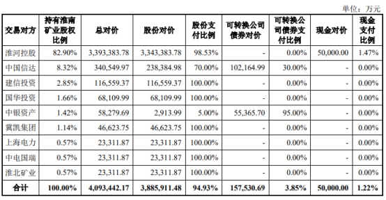 8月1日,淮河能源发布了关联交易报告书(草案)(修订稿),上市公司拟以向淮河控股、中国信达、建信投资、国华投资、中银资产、冀凯集团、上海电力(600021)、中电国瑞、淮北矿业(600985)发行股份、可转换公司债券及支付现金的方式吸收合并淮南矿业。上市公司为吸收合并方,淮南矿业为被吸收合并方。本次交易完成后,上市公司作为存续公司承继及承接淮南矿业的全部资产、负债、业务、人员及其他一切权利与义务,淮南矿业的法人资格将被注销,淮南矿业持有的上市公司股份将被注销,淮河控股、中国信达、建信投资、国华投资、中银资产、冀凯集团、上海电力、中电国瑞、淮北矿业将成为本次交易后上市公司的股东。