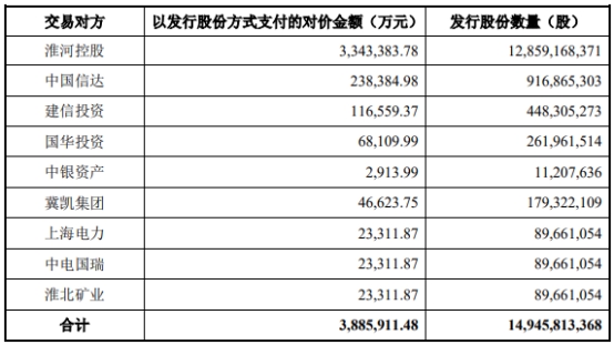 本次交易中标的资产作价4,093,442.17万元,其中以发行股份方式支付的对价金额为3,885,911.48万元。按照发行价格2.60元/股计算,发行股份数量为14,945,813,368股。本次交易后,淮南矿业持有的全部淮河能源股票将被注销。