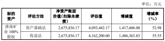 综合考虑企业的规模效益,最终选择资产基础法结果作为本次淮南矿业股东全部权益价值参考依据。由此得到淮南矿业股东全部权益在基准日时点的价值为4,093,442.17万元。(系40,934,421,670.79元向上取整至百位)。