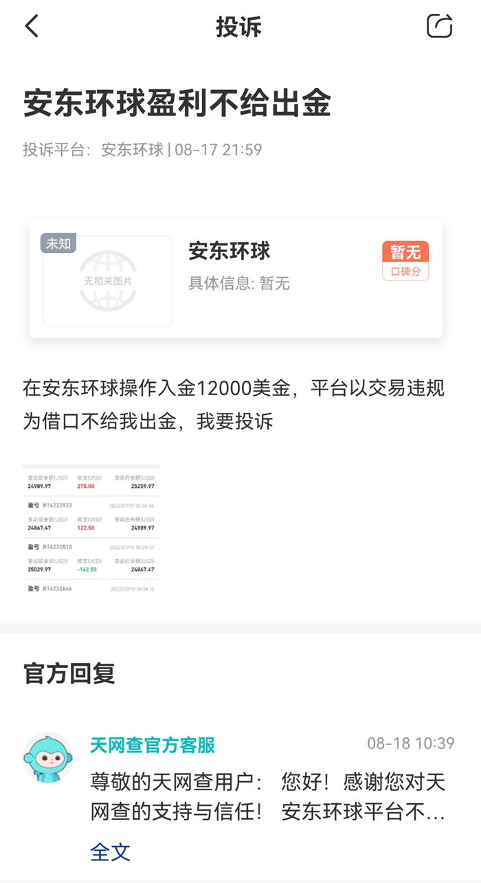 “在安东环球操作入金12000美金,平台以交易违规为借口不给我出金”。这是天网查收到一条用户投诉。