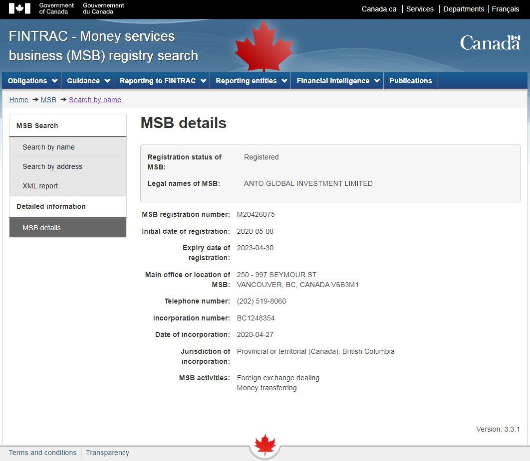 安东环球在此前的官网为了让用户认为平台是“安全”的,称其受加拿大FINTRAC监管,监管号为M20426075。