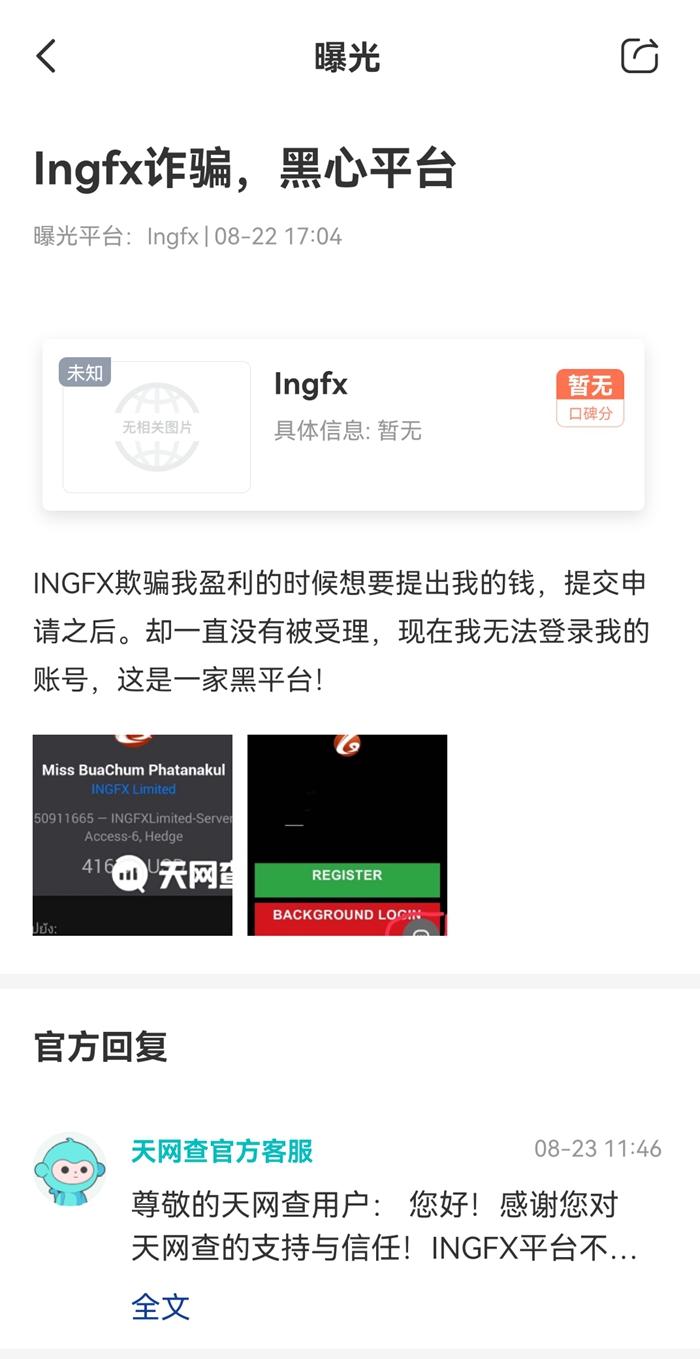 最近,天网查一位用户曝光了INGFX平台。这位用户在INGFX盈利后尝试提现,提交出金申请后却一直未被受理。更过分的是,后来用户在INGFX平台的账户直接无法登陆!用户这才意识到INGFX是个黑平台。