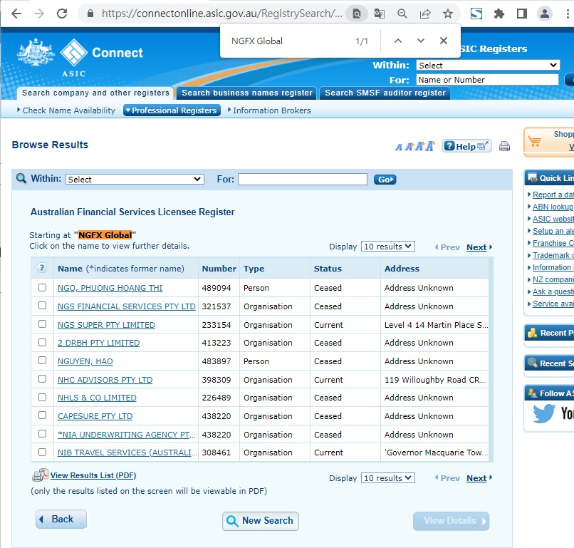 我们在澳大利亚ASIC官网的持牌登记处搜索“INGFX Global”,却没有找到任何相关信息,其所宣称监管根本就是凭空捏造。