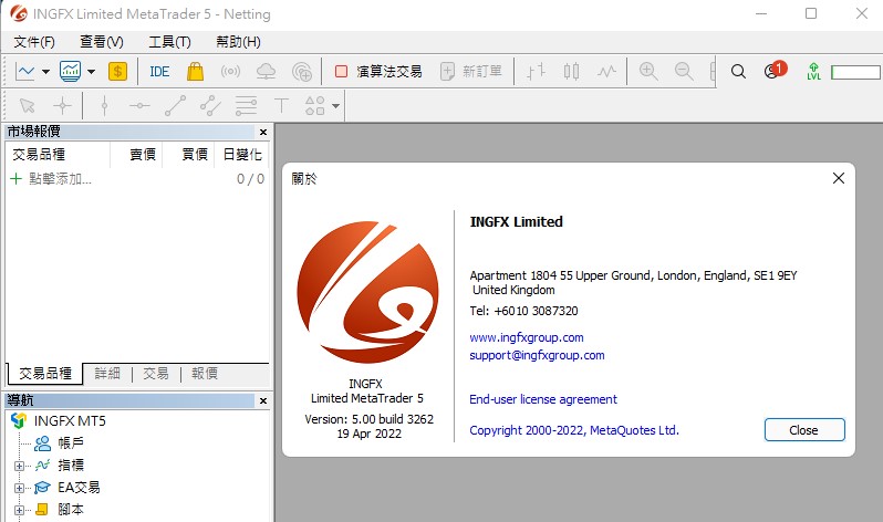为了找到更多INGFX的信息,天网查还特意下载了其MT4。它在MT4上登记的公司名称为INGFX Limited,地址位于英国。