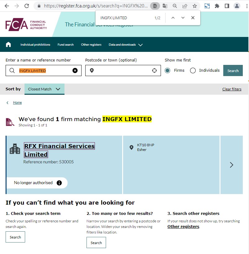 于是,我们到英国工商页查询发现,INGFX在英国有工商注册;但在英国FCA却没有相关监管信息。可见,其在MT4软件上的登记资料也全部是假。