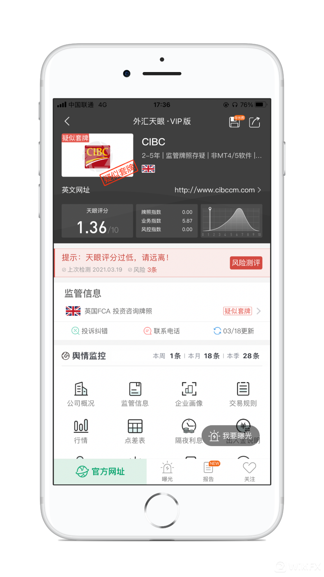 CIBC,其宣称持有的英国FCA授权的投资咨询拍照疑似套牌,从“监管中”变为“已撤销”。