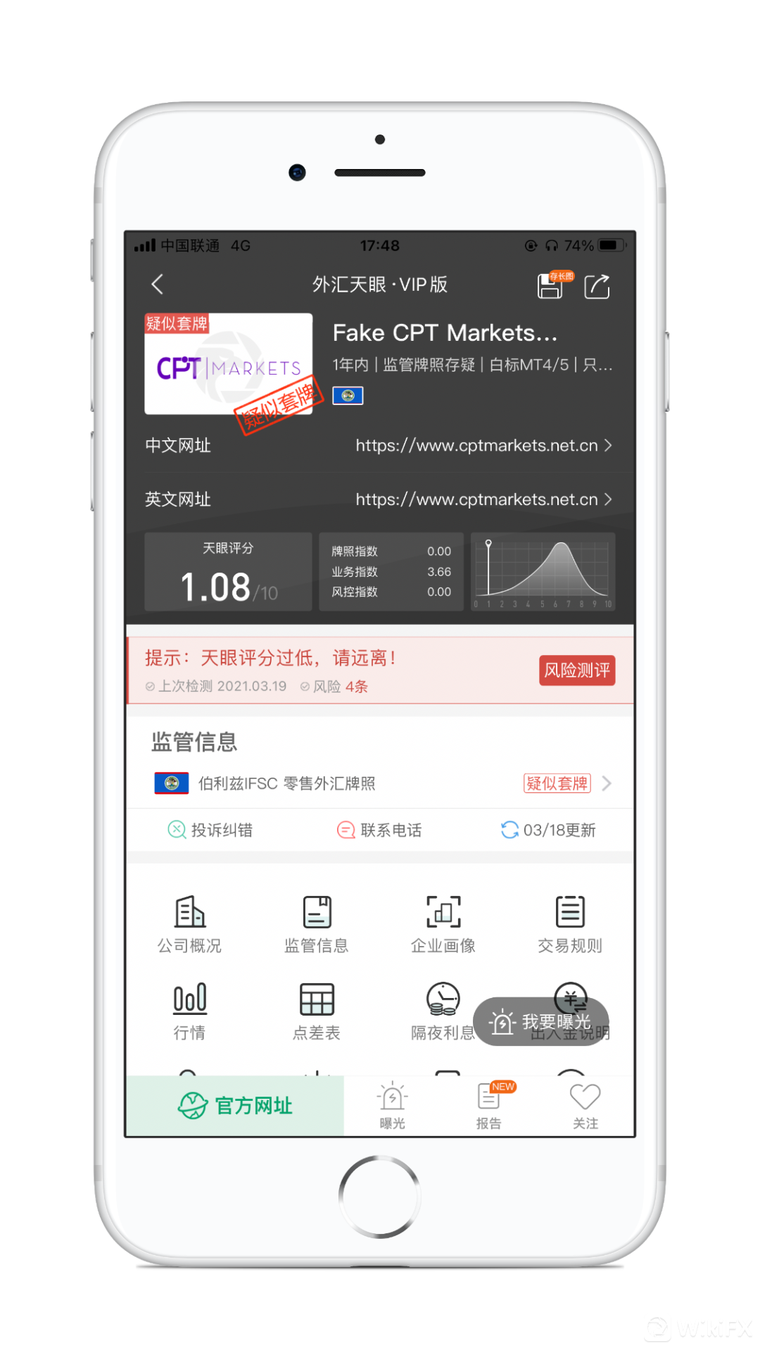 假冒CPT Markets,天眼评分1.08分,系假冒正牌交易商CPT Markets,所持牌照均被撤销后,当前无任何实际有效监管,存在巨大风险建议投资者远离。