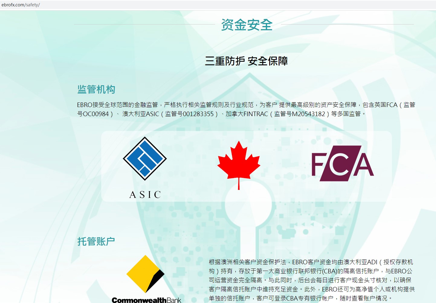 EBRO的官网显示:其隶属于 Ebro Financial Holding Co集团,EBRO接受全球范围的金融监管,包含英国FCA(监管号OC00984)、 澳大利亚ASIC(监管号001283355)、加拿大FINTRAC(监管号M20543182)等多国监管。特别突出了“三重防护,安全保障”,强调了平台的安全性。
