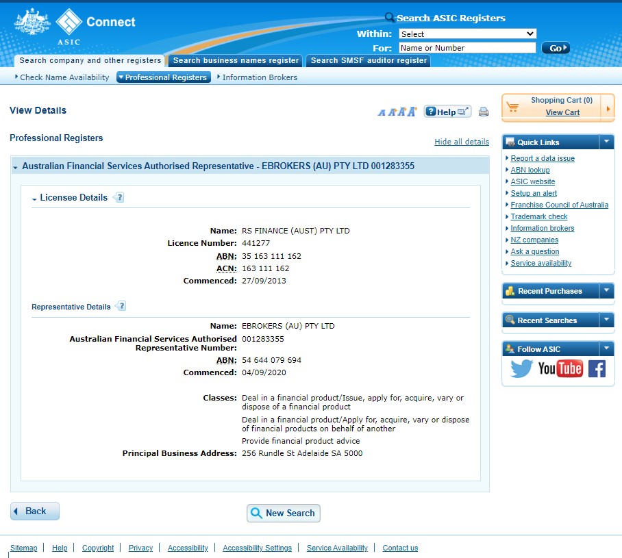 在澳大利亚ASIC官网查询监管号“001283355”,对应的公司名称为“EBROKERS (AU) PTY LTD”,与EBRO官网的描述不相符。