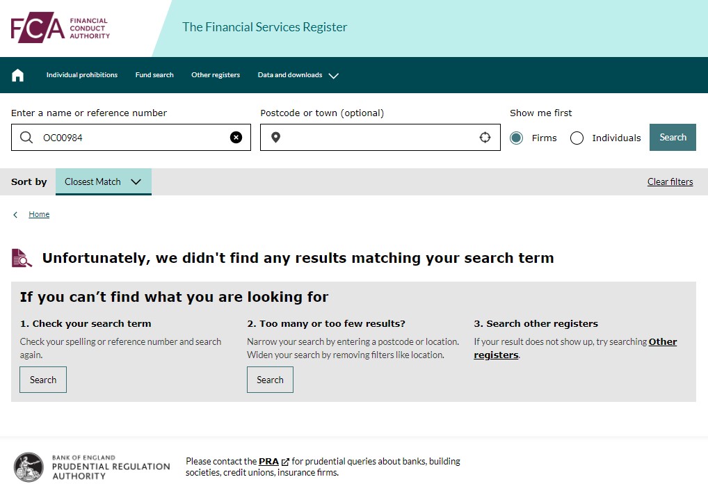 在英国FCA监管机构上输入“OC00984”,显示“we didn't find any results matching your search term(我们没有找到与之匹配的任何结果)”。 所以,宣称的FCA监管也是子虚乌有。