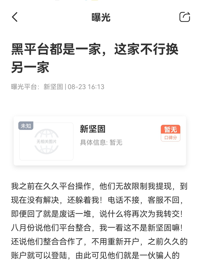 近几天,天网查收到的一条用户曝光就是这种情况。受害用户称:我之前在久久平台操作,但被他们无故限制提现,找了平台多次出金都没有得到解决。而就在这个月,久久平台突然告诉我,他们平台被整合进了新坚固平台,原来久久平台的账户可以直接在新坚固平台使用,都不需要重新开户。