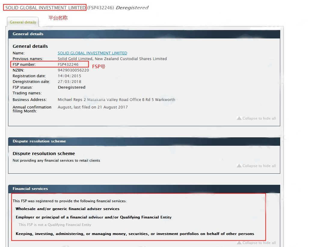其早前在官网宣称受新西兰FSP监管,网页的下方有附上一张FSP截图,但无法看清具体的FSP号。在新西兰FSP官网输入“SOLID GLOBAL”,查询到的是一个名为SOLID GLOBAL INVESTMENT LIMITED的平台。但该平台无FMA金融衍生品牌照。