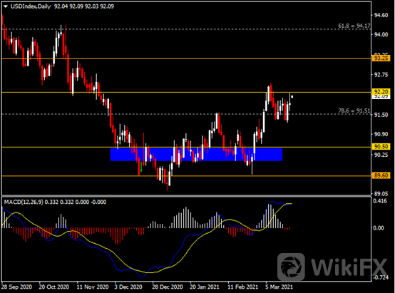 汇市方面,美元指数录得2日连阳,收于91.86。